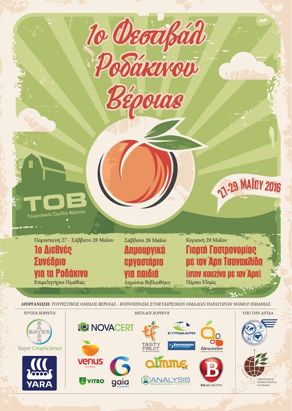 Από 27 έως 29 Μαΐου 2016 θα πραγματοποιηθεί στη Βέροια το 1ο Φεστιβάλ Ροδάκινου, όπως ανακοινώθηκε